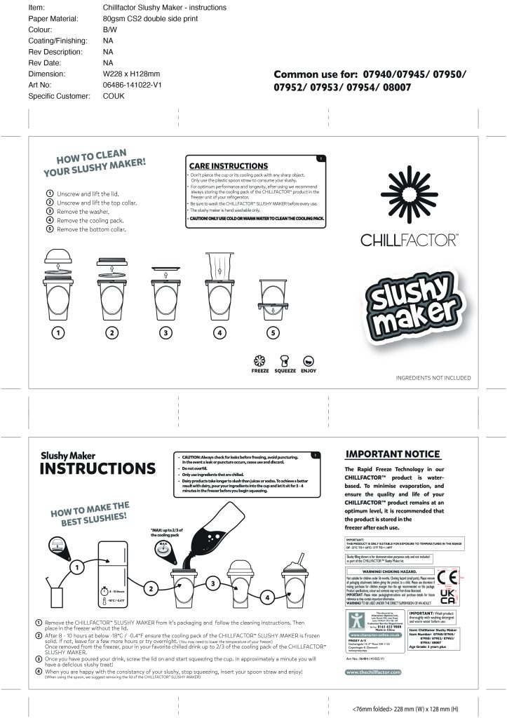 For more information on how to care for your Chillfactor slushy maker and how to make the best slushies please download our (PDF) Instructions manual. If you have an issue that can't be resolved by the instruction manual please contact the Character Options customer care team by emailing . Character Options are the UK distributor of Chillfactor.